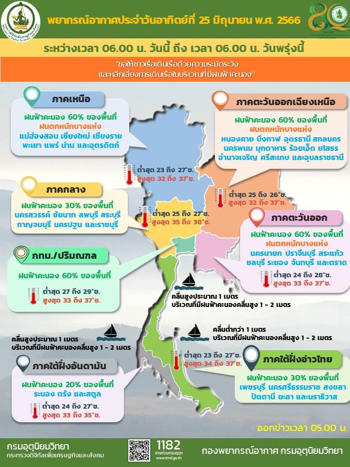 พยากรณ์อากาศ 24 ชั่วโมงข้างหน้า ร่องมรสุมพาดผ่านตอนบนของภาคเหนือ และประเทศลาวตอนบน เข้าสู่หย่อมความกดอากาศต่ำบริเวณประเทศเวียดนามตอนบน ประกอบกับมรสุมตะวันตกเฉียงใต้ยังคงพัดปกคลุมทะเลอันดามัน ประเทศไทย และอ่าวไทย ลักษณะเช่นนี้ทำให้ประเทศไทยมีฝนเพิ่มขึ้น และมีฝนตกหนักบางแห่ง ในภาคเหนือ และภาคตะวันออก โดยมีฝนตกหนักมากในภาคตะวันออกเฉียงเหนือ